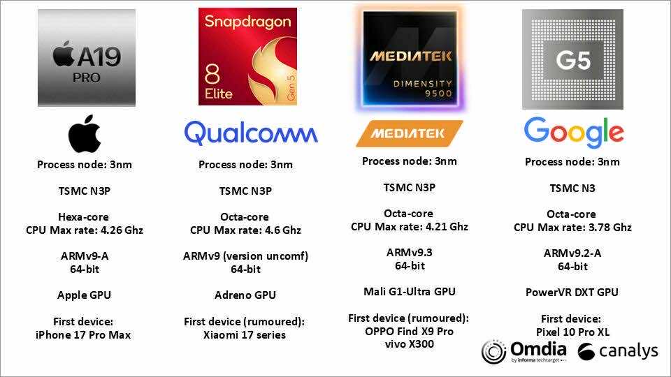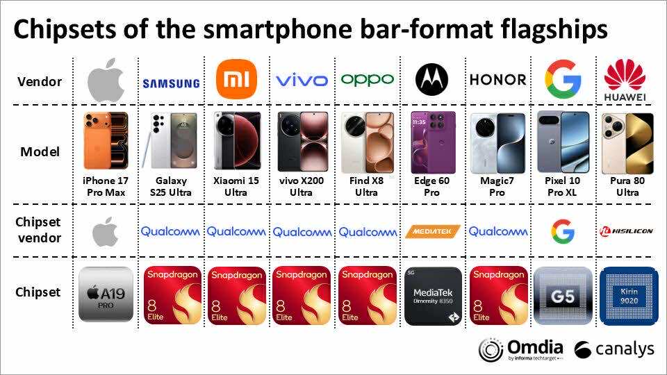 Rynek flagowych układów SoC staje się coraz bardziej konkurencyjny, dając producentom OEM więcej możliwości dywersyfikacji swojej flagowej oferty i negocjowania lepszych cen z dostawcami układów SoC. Qualcomm przygotowuje swoją flagową generację z niestandardowymi rdzeniami Oryon, obiecując wyższą wydajność i efektywność, podczas gdy Samsung ponownie wkracza do tego segmentu z układami SoC Exynos i odzyskuje część udziału w rynku od Qualcomm. Tensor firmy Google nadal wprowadza innowacje w GenAI, wykorzystując swoje modele Gemini.