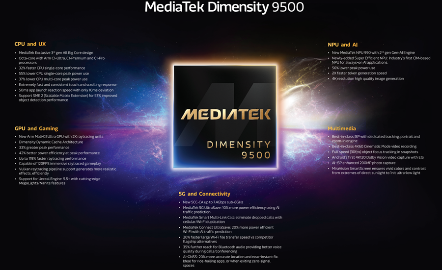 Dimensity 9500 ma trzecią generację konstrukcji procesora z wieloma rdzeniami, opartą na najnowszej rodzinie ARM Cortex-X1. Zapewnia on do 32% wyższą wydajność pojedynczego rdzenia i 37% niższe zużycie energii w porównaniu z Dimensity 9400. Ponadto nowy układ SoC będzie oferował do 29% wyższą wydajność pojedynczego rdzenia i 16% wyższą wydajność wielordzeniową, jednocześnie zmniejszając zużycie energii przez ultra-rdzenie nawet o 55% przy maksymalnej wydajności w porównaniu z poprzednią generacją.