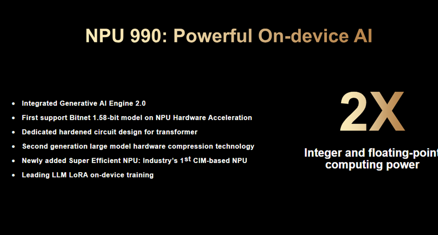 Dimensity 9500 jako pierwszy obsługuje zintegrowaną architekturę Compute-in-Memory dla nowo dodanego, superwydajnego procesora NPU. NPU wykorzystuje technologię kompresji sprzętowej dużych modeli drugiej generacji, zmniejszając wymagania dotyczące pamięci i przepustowości, oraz obsługuje pierwsze w branży generowanie tekstu do obrazu w ultra wysokiej rozdzielczości 4K.