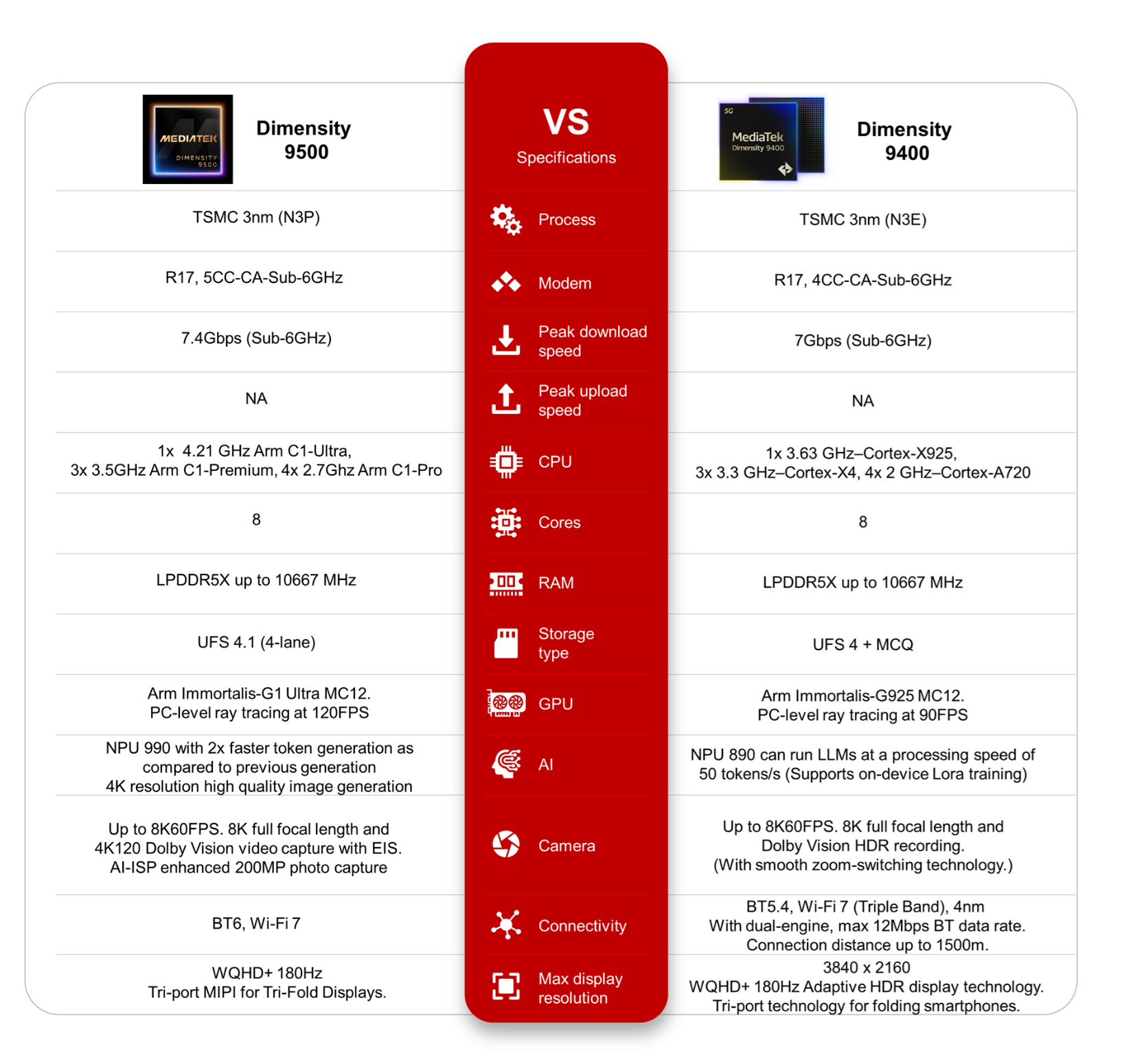 Dimensity 9500 przewyższa swojego poprzednika, Dimensity 9400, w wielu obszarach. Oba są oparte na technologii 3 nm firmy TSMC, ale 9400 wykorzystuje proces N3E, podczas gdy 9500 jest produkowany w bardziej zaawansowanym węźle N3P, oferującym lepszą wydajność i efektywność.